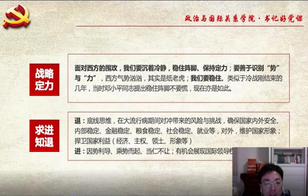 第二期研究生线上活动之“理想信念教育”于5月5日晚开讲。在“如何看待当前中国的外交局面”主题微党课中,院长胡宗山分析了西方政客对中国防疫“八论四法”的错误论调,在西方国家的污名化和攻击下,中国面临四面楚歌的外交困局。胡宗山院长谈到,在外交舆论斗争中,要学会斗争艺术,系统组织精准布局,要运用好“统一战线、武装斗争和党的建设”。中国应加强战略定力,沉着冷静识别“势”与“力”,以求进知退的态度面对当前复杂的国际形势,在坚持底线思维的同时抓住机遇乘势而起。最后,胡宗山院长强调作为党员和青年学生,有必要了解当前国际局势和中国的外交局面,提升理论素养水平,不断锤炼自我,强化实干担当。