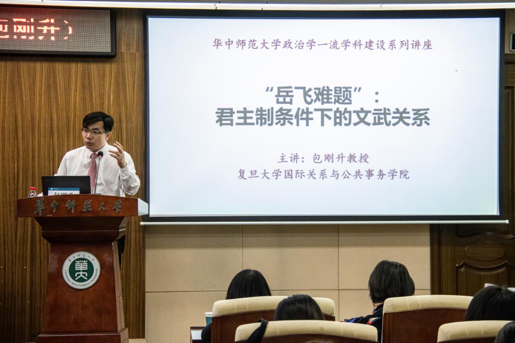 (通讯员:戴程娟)为扎实推进华中师范大学政治学世界一流学科建设,提高学生的学术思维与能力,必赢76net线路(以下简称:政国院)邀请了复旦大学包刚升教授为同学们带来题为“岳飞难题:君主制条件下的文武关系”的学术讲座。本次讲座于2021年5月6日晚在逸夫国际会议中心一楼报告厅举行,政国院袁方成教授主持了本次讲座。