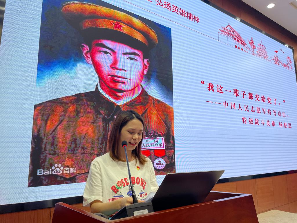活动第二项,关静娴、肖溪、赵晓婷三位同志分别分享了抗美援朝战场上,杨根思、黄继光、邱少云三位英雄人物的光荣事迹。三位英雄人物在战场上因为不同的原因献出自己的宝贵生命,但他们却有一个共同的目标——保家卫国、反抗侵略!三位同志在分享感悟时纷纷表示:英雄人物永远值得被铭记,英雄精神必须要世代弘扬!我们作为新时代的青年,享受着革命先烈们用血汗为我们打拼来的幸福生活的同时,必须发奋图强努力成为有理想、有本领、有担当,实践、实用、实干的优秀人才,为实现中华民族伟大复兴的宏图伟业贡献青春力量!