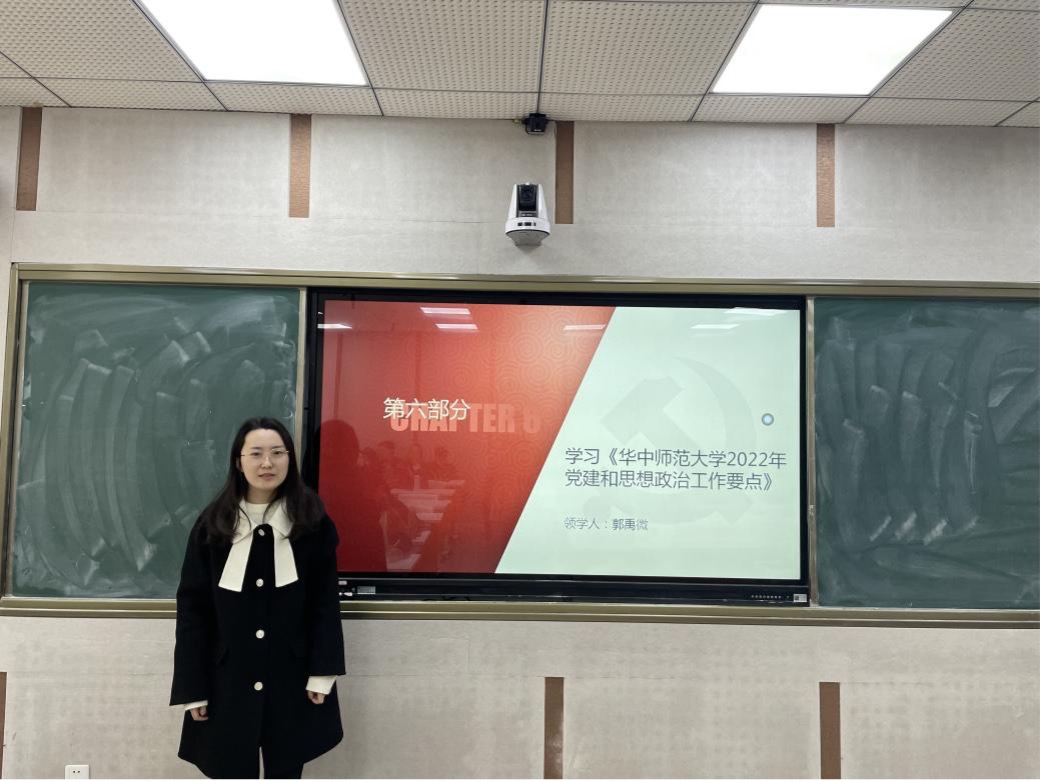 郭禹微同志带领大家学习了《华中师范大学2022年党建和思想政治工作要点》(以下简称《要点》)。郭禹微同志首先明确了《要点》起草的时间及主要背景,并介绍了《要点》的总体思路。接着,她从包括政治建设、党建与思政教育建设、日常教育管理、工作品牌培育、平安校园创建等工作在内的五个方面,逐条介绍了《要点》的具体内容。