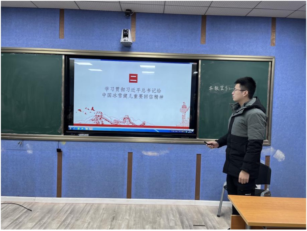 活动第二项,由金杰同志带领共同学习习近平总书记给中国冰雪健儿重要回信精神。首先为大家播放人民日报连线采访苏翊鸣新闻视频,通过视频进行一个简单的回顾;紧接着,金杰同志向大家展示回信全文;最后,金杰同志以习近平总书记对时代青年的期盼要求为结语,鼓励大家在最美的青春年华,向冰雪运动健儿学习,顽强拼搏,成就更好的自己。
