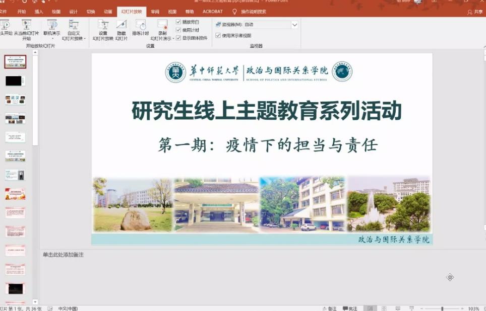 学院于4月28日晚召开了“战疫政能量”主题教育活动一——“疫情下的责任与担当”。活动由院党委书记段维讲授《疫情下的责任与担当》主题党课,并邀请到中央电视台法语频道主播朱婧天分享她的战“疫”故事。此次主题教育活动由院研究生辅导员骆婉婷主持,18、19级全体研究生参加。