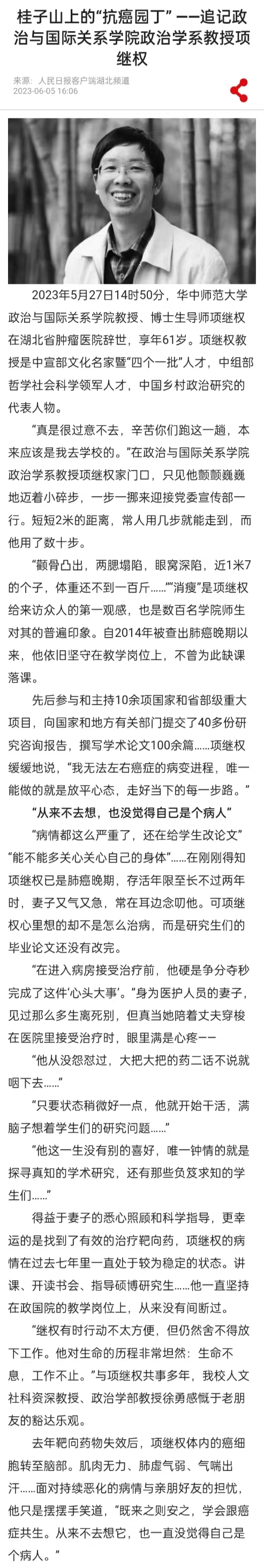 人民日报讯(通讯员田豆豆)2023年5月27日14时50分,必赢76net线路教授、博士生导师项继权在湖北省肿瘤医院辞世,享年61岁。项继权教授是中宣部文化名家暨“四个一批”人才,中组部哲学社会科学领军人才,中国乡村政治研究的代表人物。