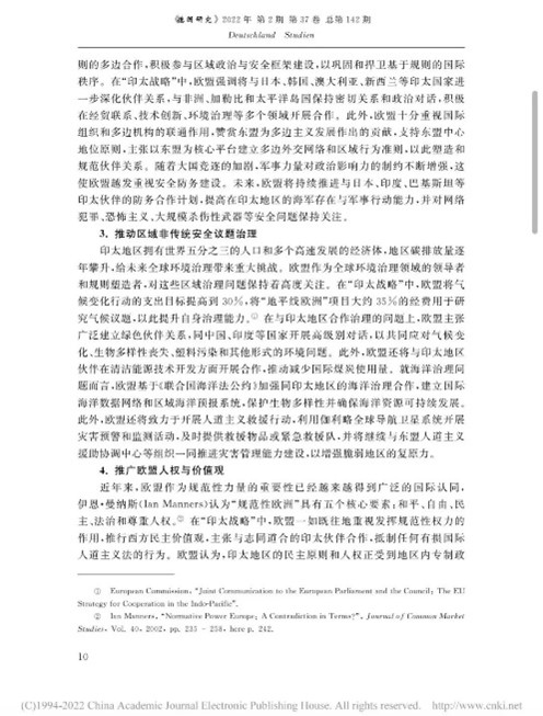 本文从2021年欧盟发布的《欧盟印太合作战略报告》入手,深入剖析欧盟印太战略变化的发布和推进,选题具有较强的新颖性和实用性。文章从欧盟“印太战略”生成逻辑、战略内涵和影响研判展开,总结得出欧盟的“印太战略”体现了其提升战略自主、重塑欧洲辉煌的战略意图,但是欧盟内部在“印太战略”发布和实施上存在意见分歧的重要观点。同时指出,中国需要承认印太地区的存在与重要性,并尽早拿出中国的“印太方案”。全文结构科学合理,逻辑性强,思路清晰,对问题的分析比较透彻,对于分析欧盟印太战略具有重要意义。